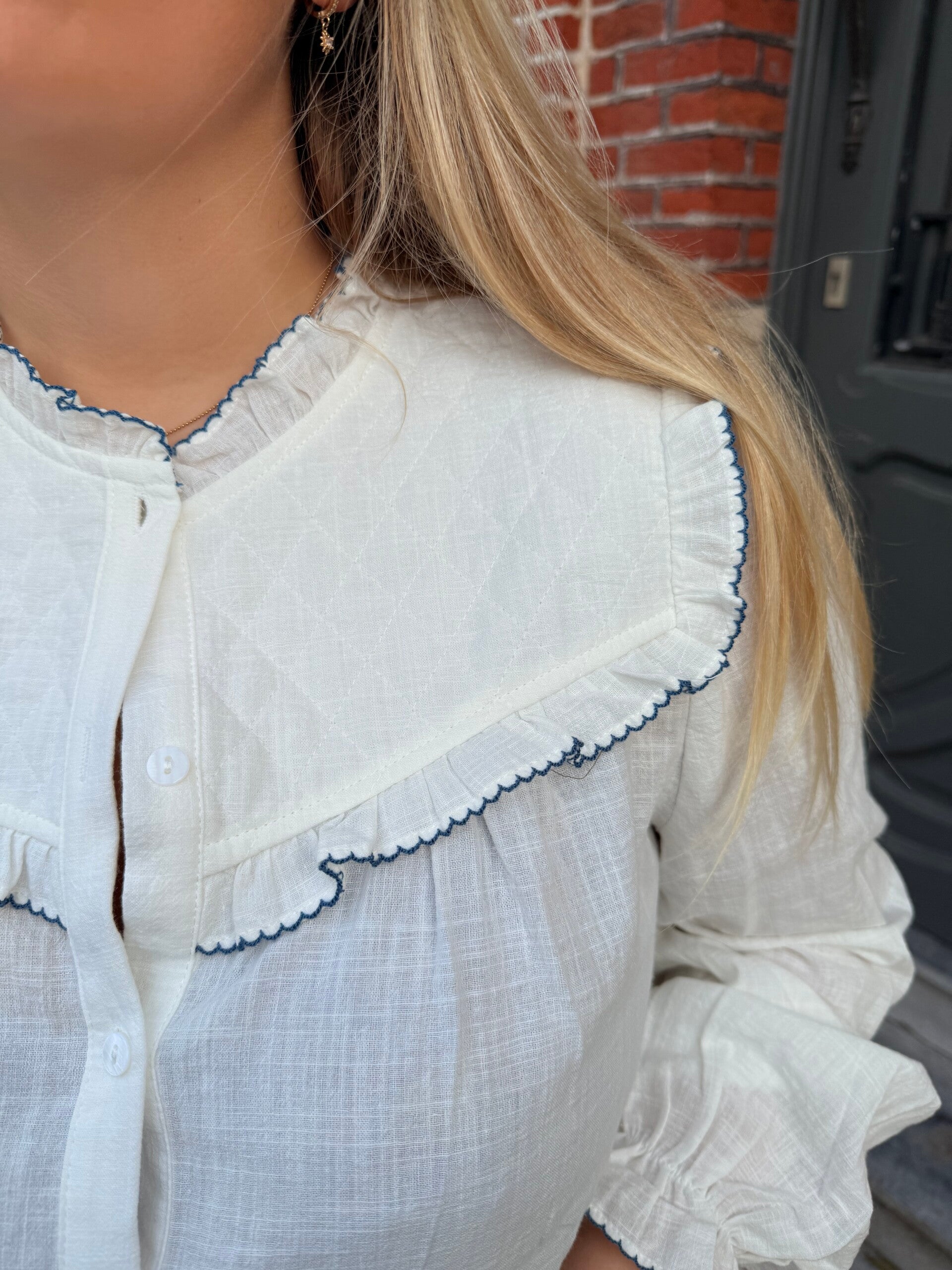 • Elegante blouse met een vrolijk, kleurrijk detail aan de mouwen en kraag, een echte blikvanger voor elke gelegenheid.