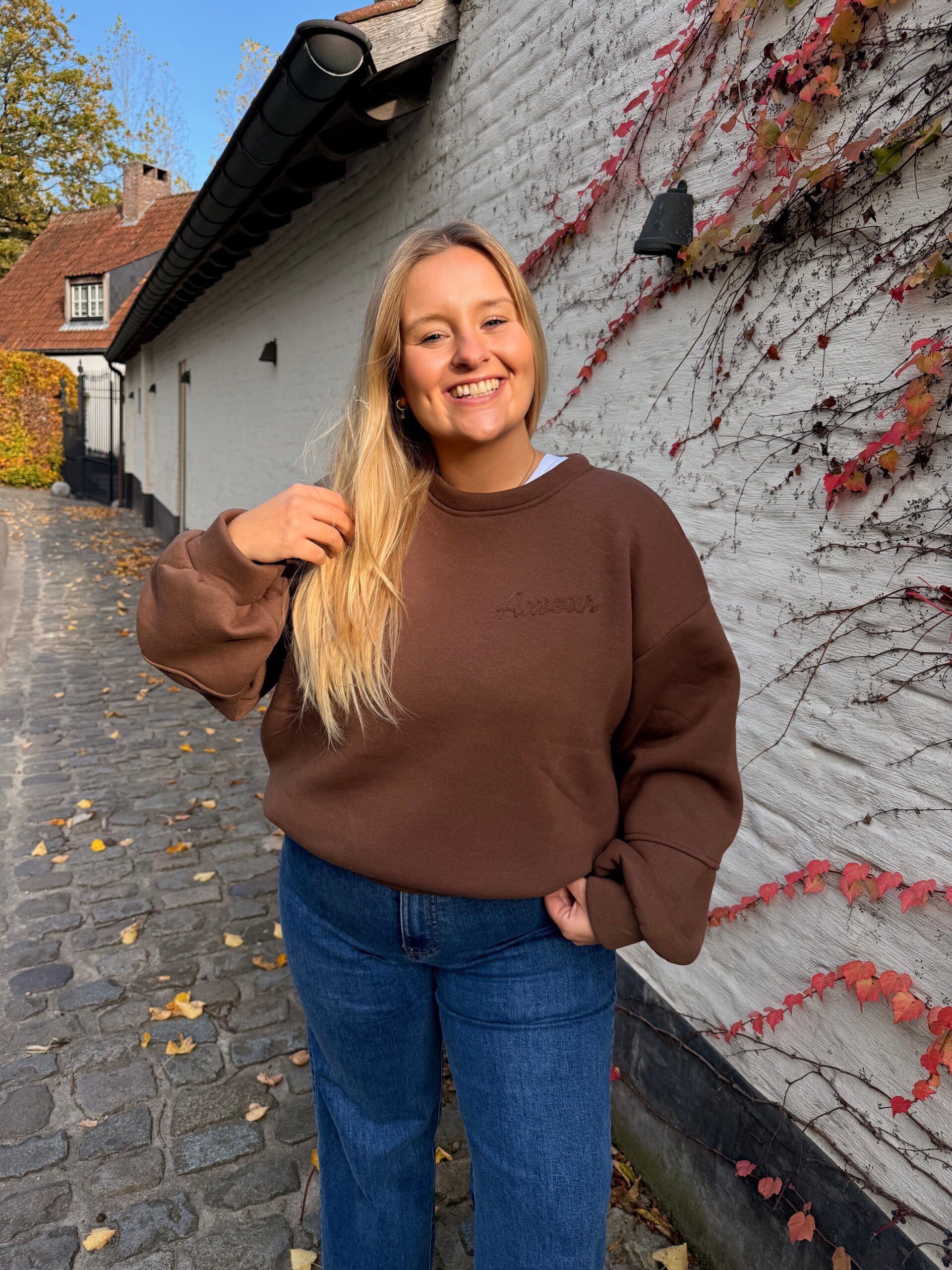 Heerlijk warme trui in een zachte bruine kleur, met een opvallend hart met ‘Amour’ op de achterkant voor een speelse touch. De oversized pasvorm zorgt voor een comfortabele, relaxed look.