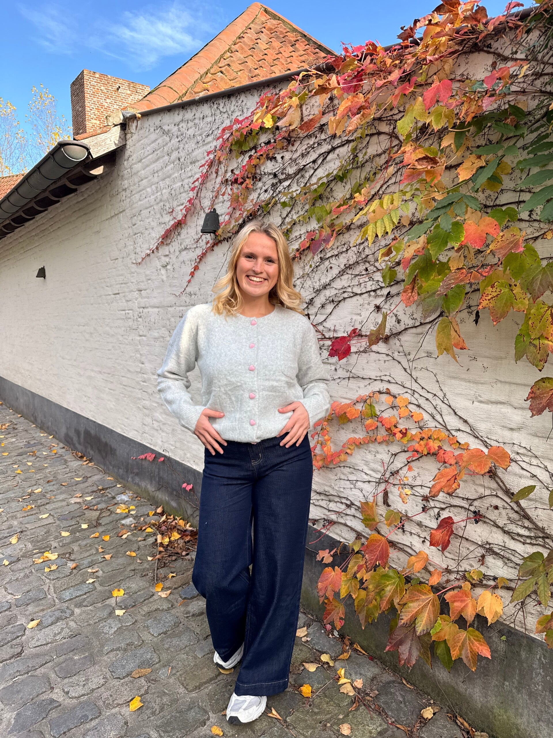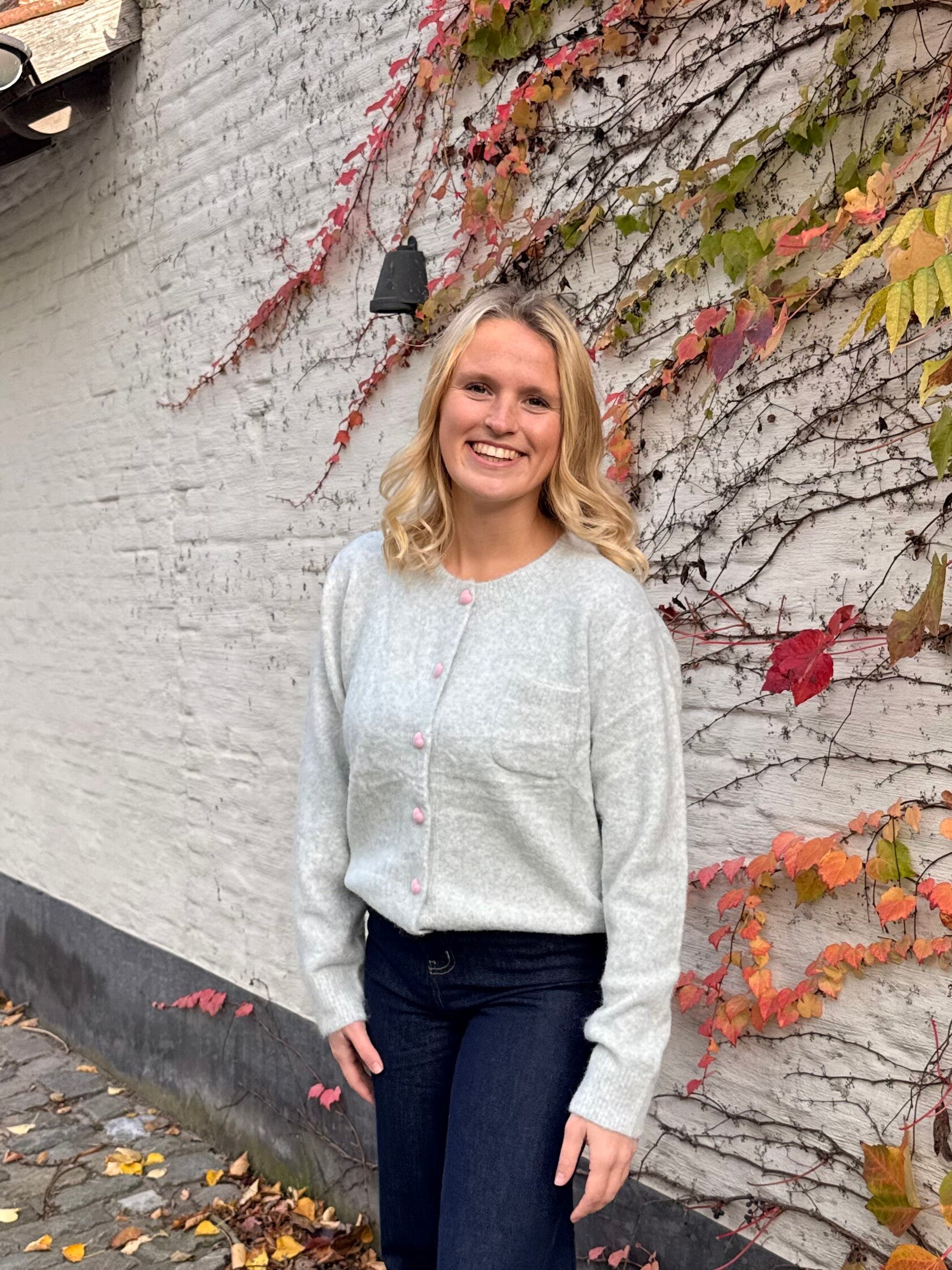 Heerlijk zachte trui in grijs, met schattige roze hartjes als knopen voor een speelse en vrouwelijke touch. Het comfortabele model maakt deze trui ideaal voor een cozy, dagelijkse look.
