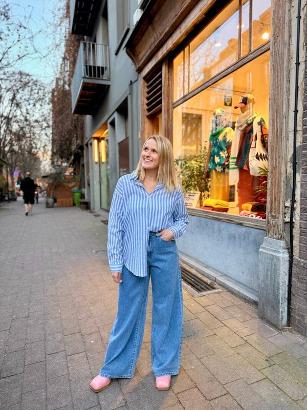 De Amy jeans is een comfortabele blauwe jeans met harten op de achterzak.