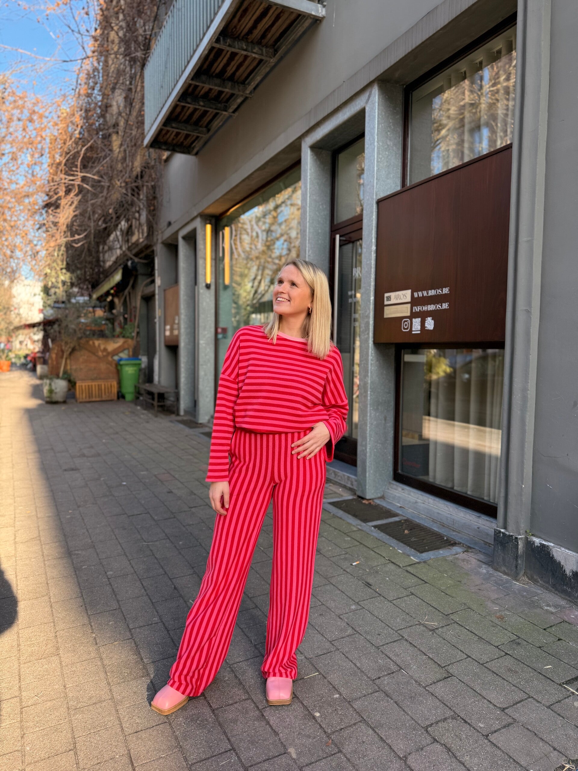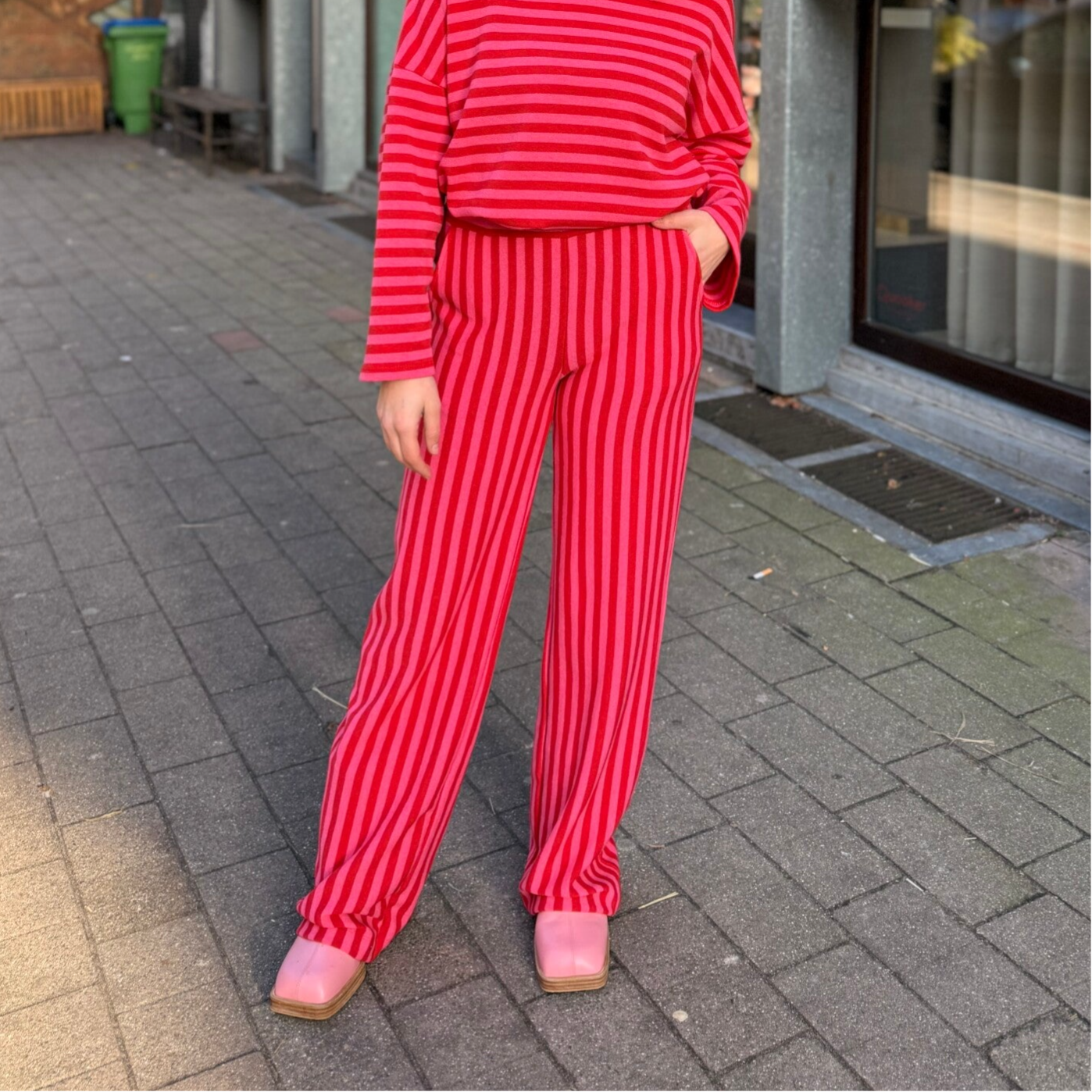 De Chiara pants is een roos-rood gestreepte broek die je in huis moet hebben! Kan leuk gecombineerd worden voor op jouw werk, maar ook gewoon als huispak.