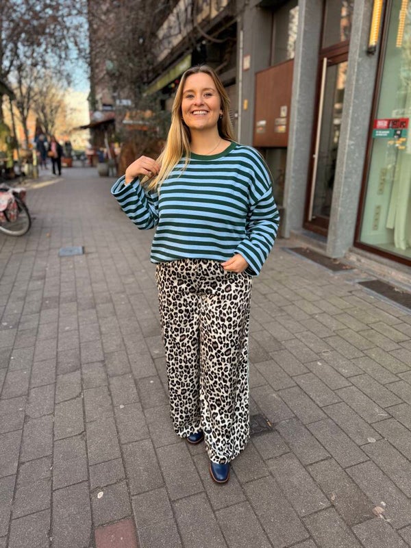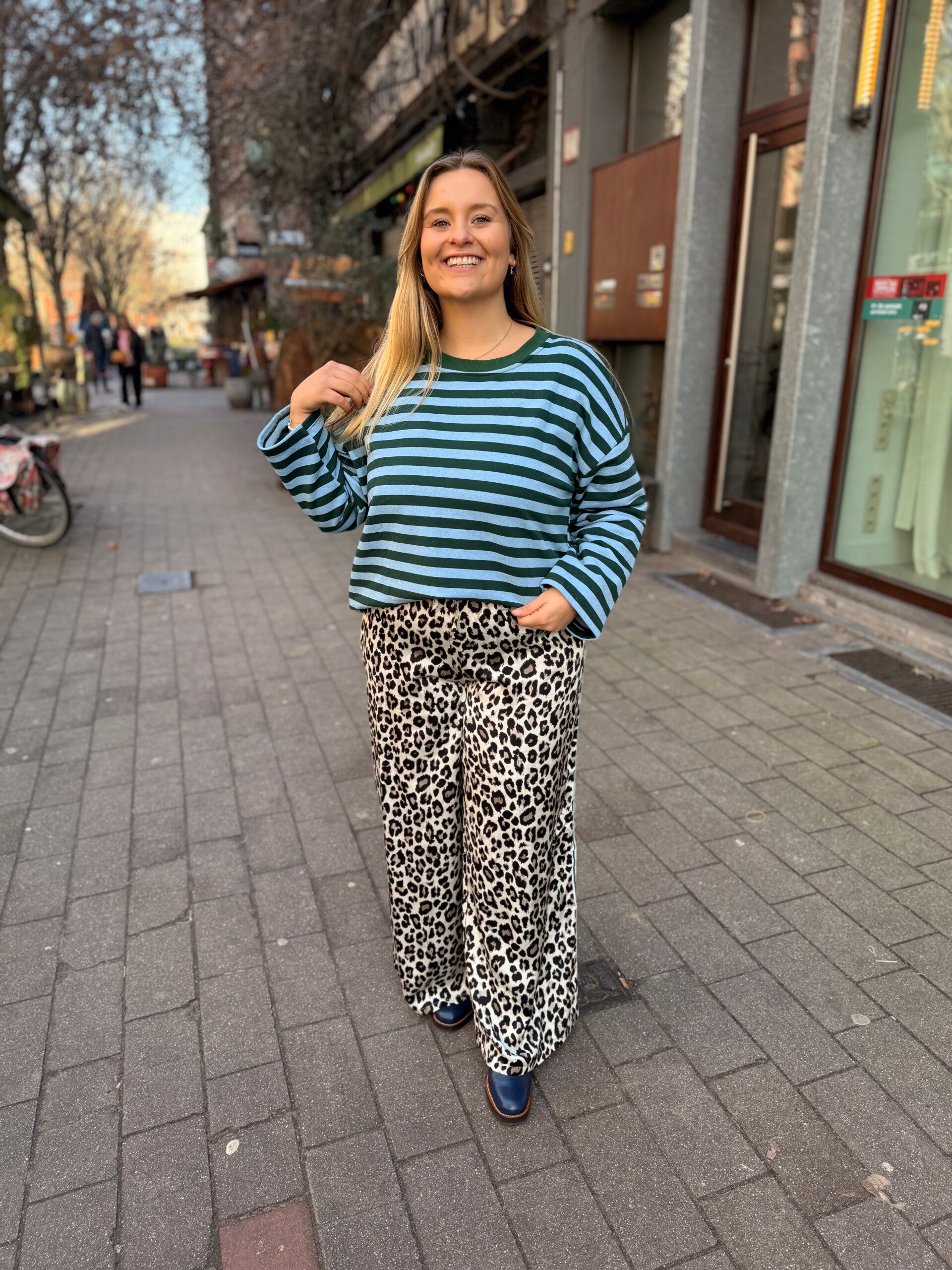 Losse panterbroek met groen-witte strepen langs de zijkant.