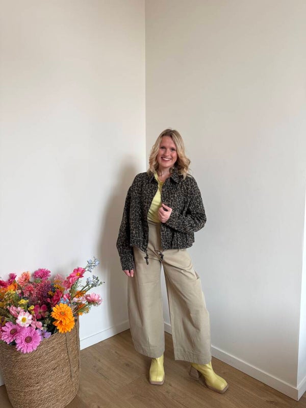 Pasvorm: trendy bombermodel. Onderaan afgewerkt met een touwtje om het jasje speels te croppen.