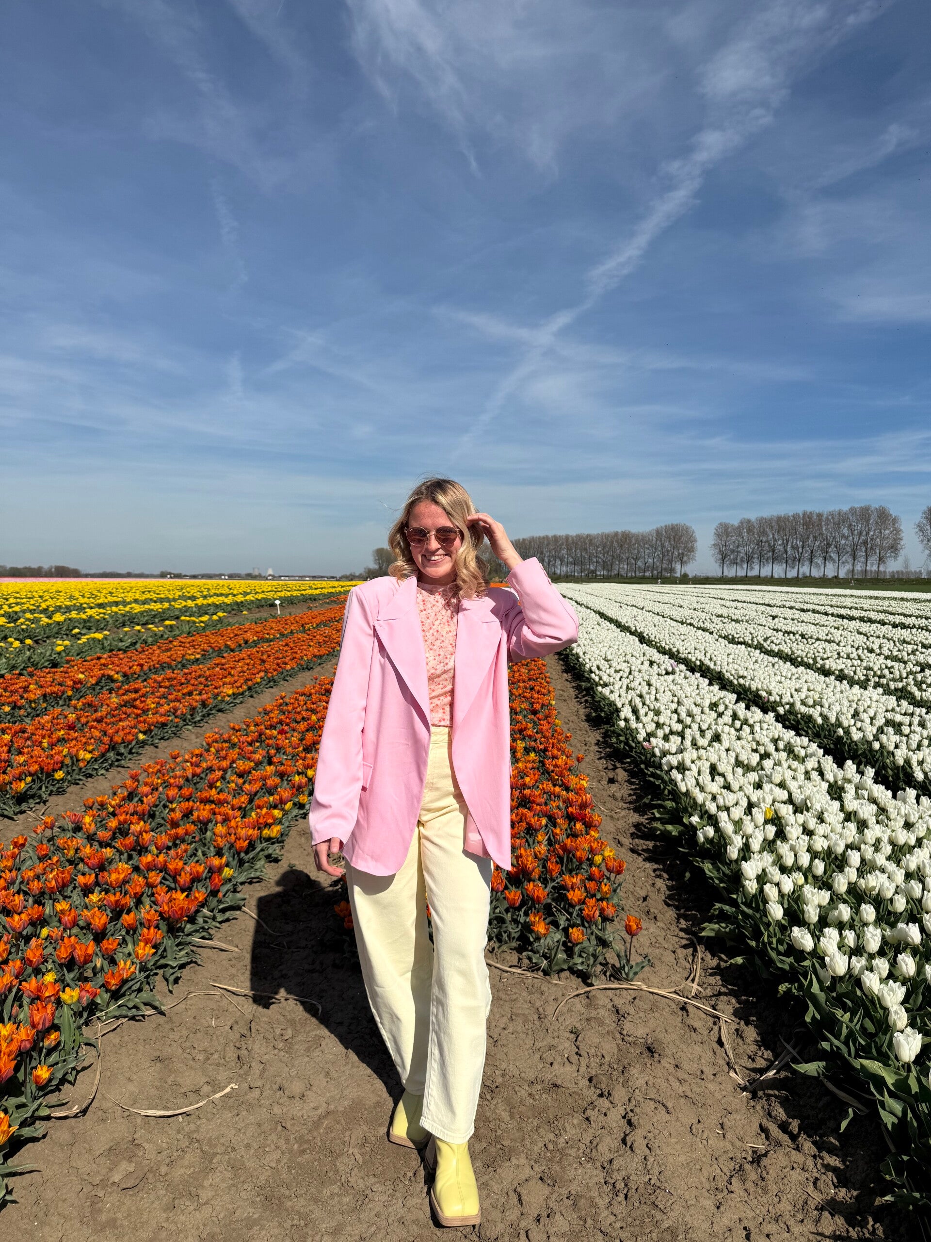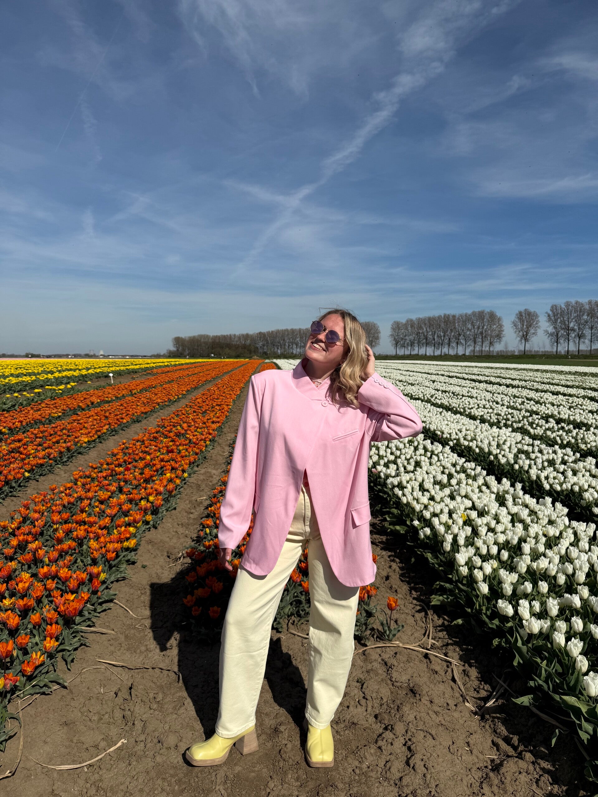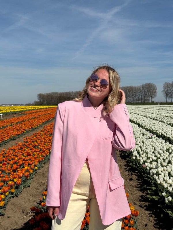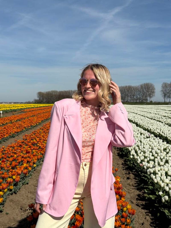 Pasvorm: Valt iets losser. Blazer kan dicht gedragen worden met een schuine snit. Open valt de blazer met een normale snit. Luchtige stof, ideaal voor de lente.