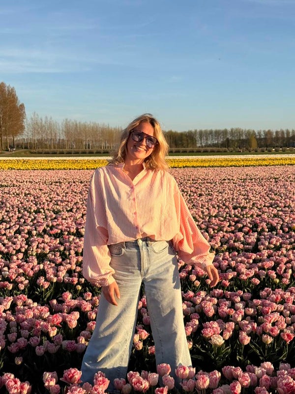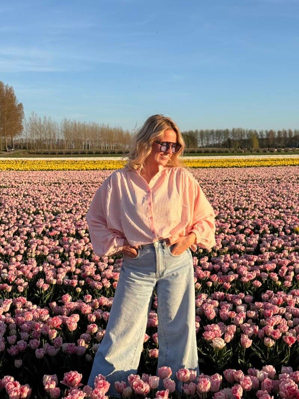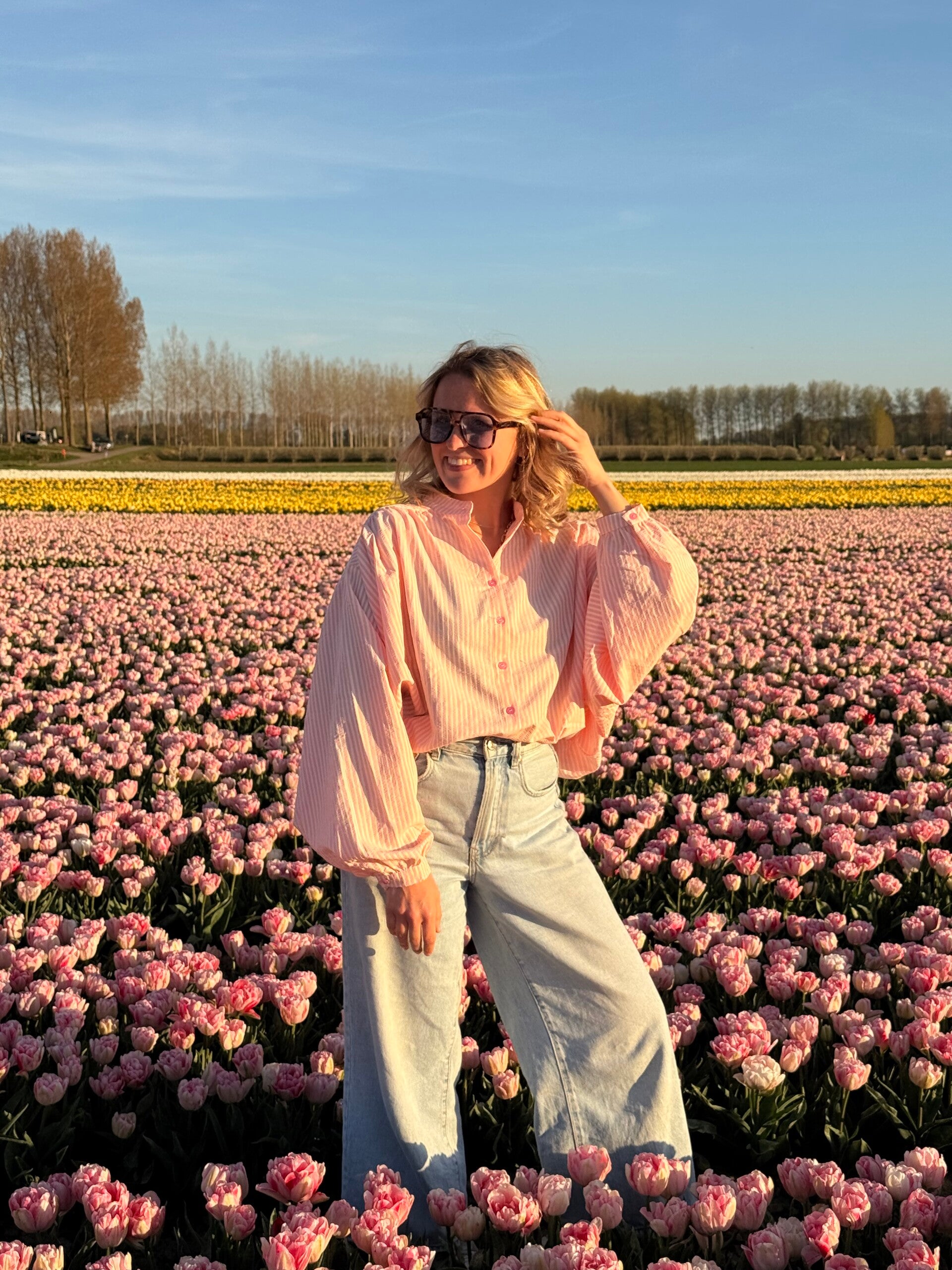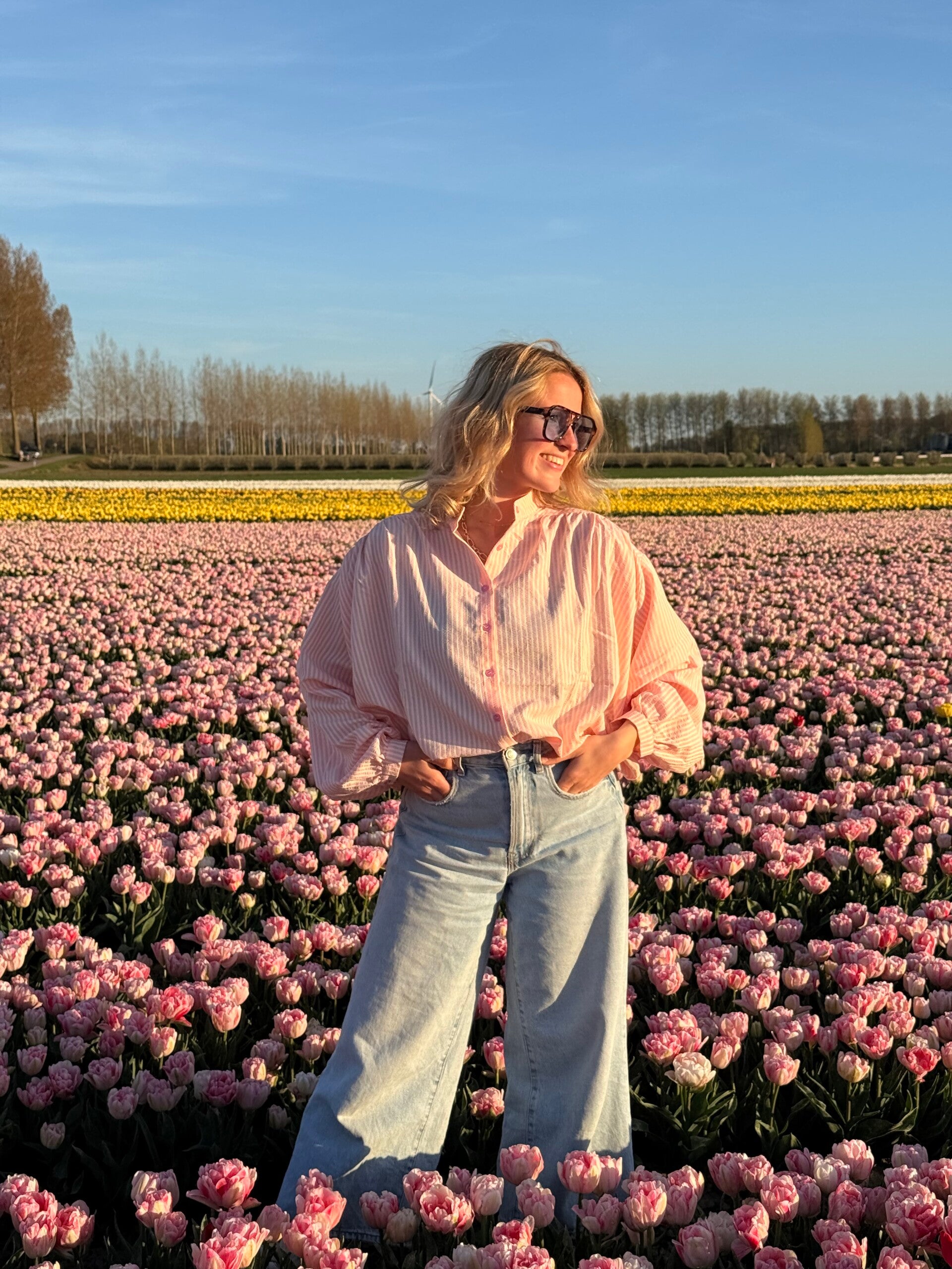 De Isa blouse is ook verkrijgbaar in het butteryellow met blauwe strepen.